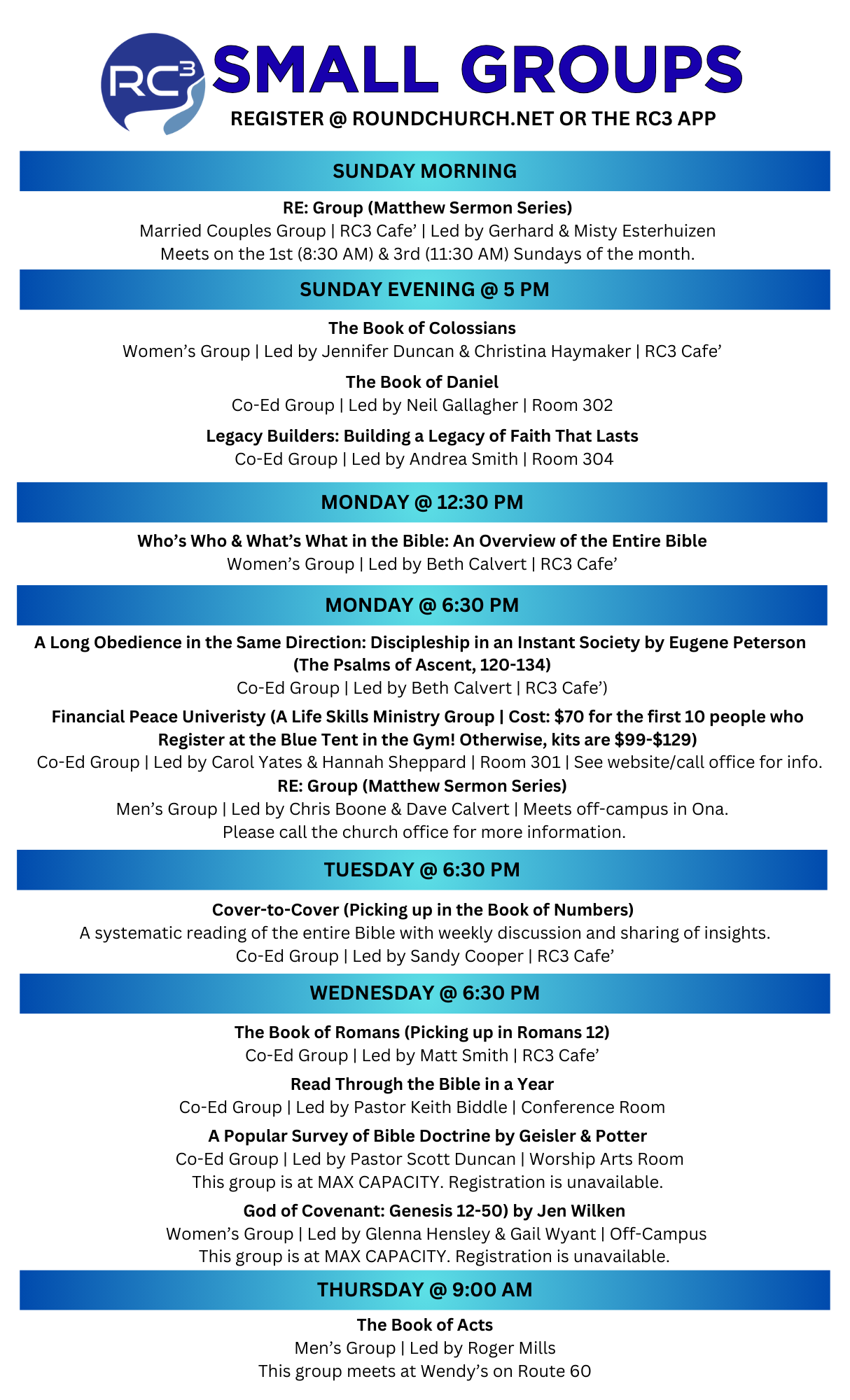 SMALL GROUPS are a biblical, practical, and effective way to help people take their next steps with Jesus and grow in community. They are made up of people who meet together regularly to study God's Word, pray together, have fun together, and live out the Great Commission together. Our groups take place throughout the week on campus and in different neighborhoods, so tap the box below to see details about each of our fall small groups, then use the form below to register for a group that's right for you. We'd love to have you join us!